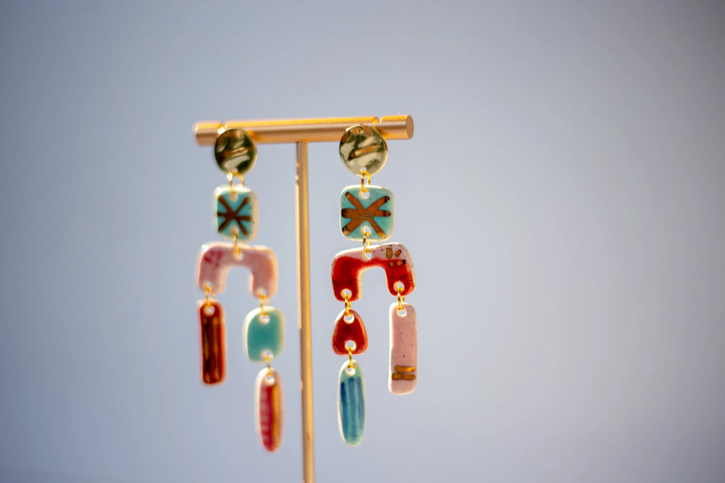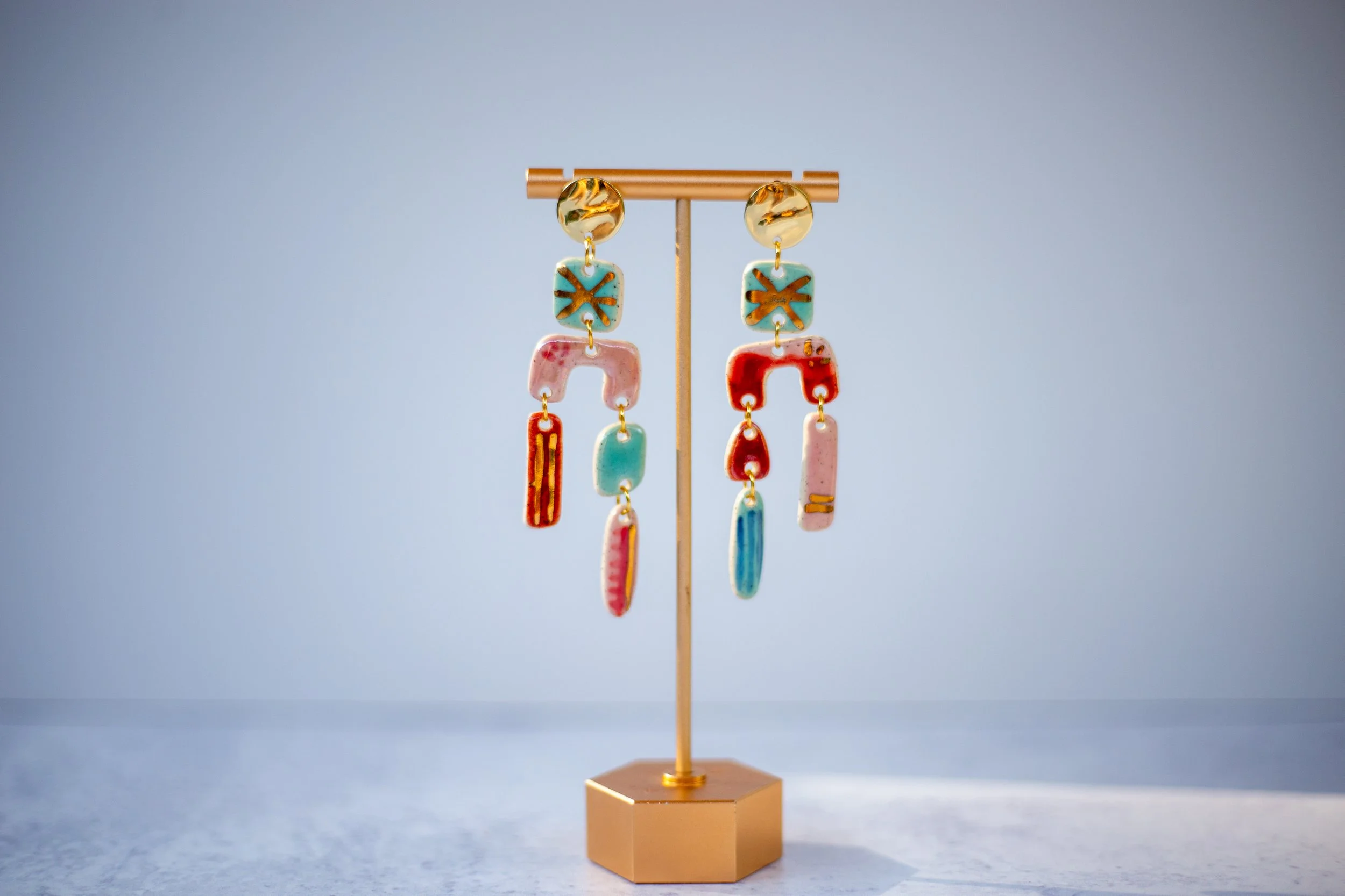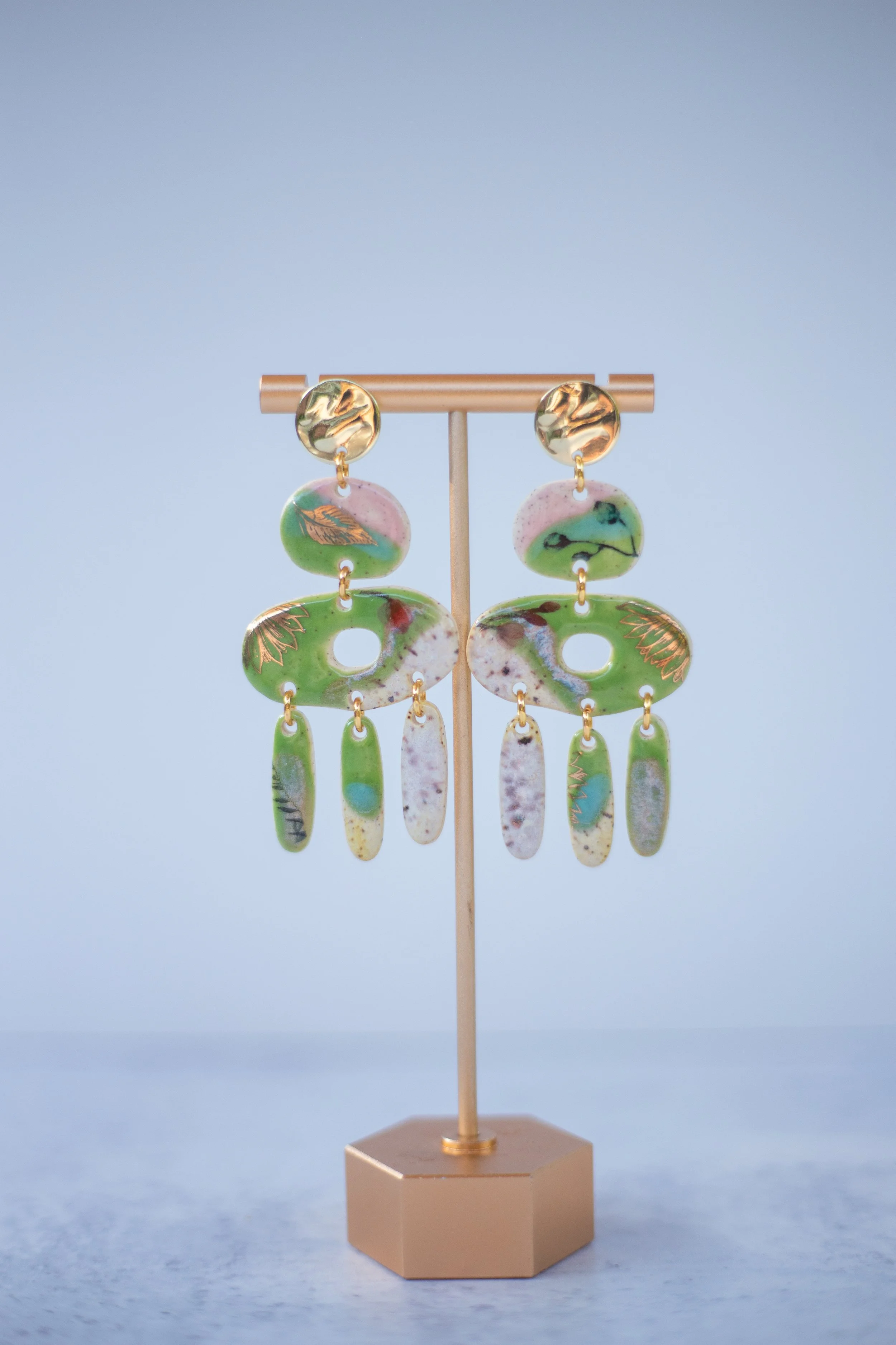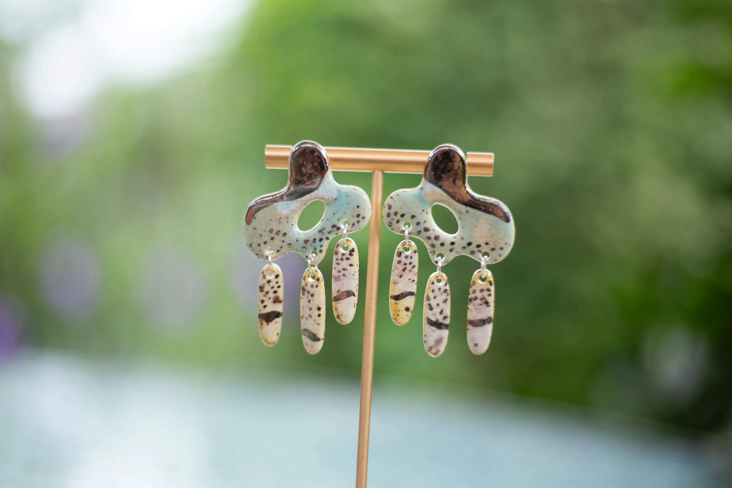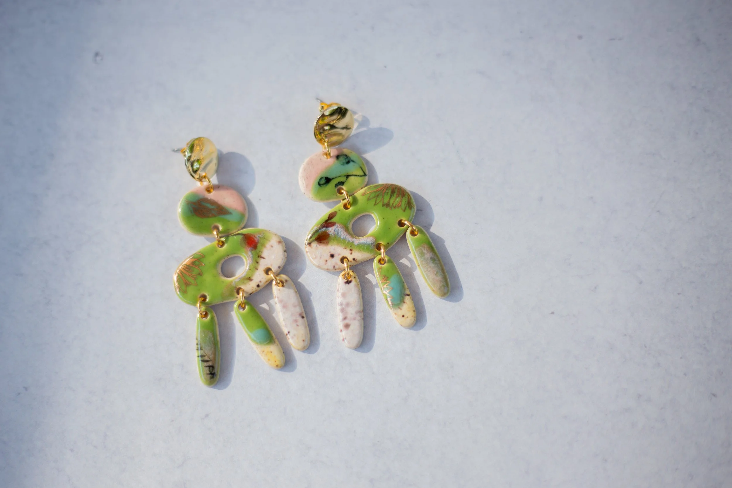 All Shop Neola pieces are handmade ceramic and detailed with luster and 22-karat gold. Each piece uses multiple glazes to create a colorful piece of art for your ears. All pieces undergo many firings in order to complete a complex and charming look that embodies both nature and beauty.